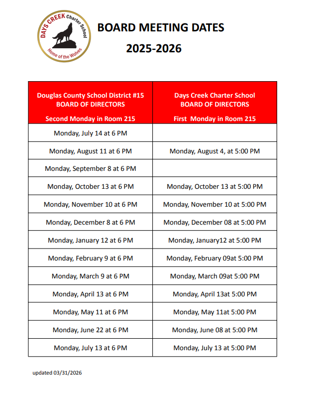 Days Creek Charter School is a public school operated by a group of parents, teachers, and community members as a school of choice within the Douglas County School District. The regularly scheduled meetings are held the second Monday of various months, starting at 5:00PM, Days Creek Charter School, RM 217. Visitors are encouraged to attend. Time is provided each meeting for public comment.