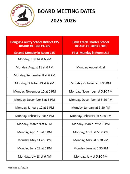 The Douglas County School District #15 is elected by the people to govern Days Creek Charter School through the policies they make. Teh regularly scheduled meeting is on the second Monday of each month, starting at 6:00PM, Days Creek Charter School, Rm. 215. Visitors are welcome and encouraged to attend. Time is provided each meeting for public comment. The Core Values of the District Board of Directors are CHARACTER, COMMUNITY and COMMITMENT.